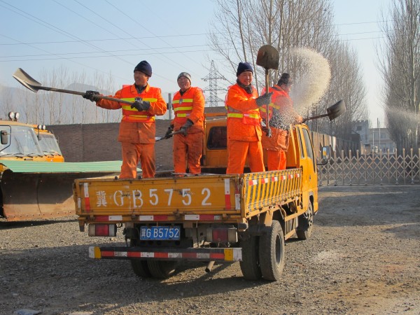 上午8:30分,總工程師王啟成宣布演練開始。接到雪情通知,養(yǎng)護(hù)工區(qū)立即通知維修隊(duì)所有成員緊急集合,并調(diào)配1臺吹雪車、2臺推雪車、2臺裝載機(jī)、2臺融雪劑播撒車、2臺灑融雪液車、1臺吹雪工具車快速部署到位,分工協(xié)作,展開除雪作業(yè)。監(jiān)控中心利用全程監(jiān)控系統(tǒng)對全路段雪情進(jìn)行即時(shí)觀測,并不斷向指揮部門匯報(bào),同時(shí)在可變情報(bào)板上及時(shí)公布雪情信息。經(jīng)過努力,路面積雪被清理干凈,保證了京張高速的全線暢通。10:50分,演練活動(dòng)成功結(jié)束。