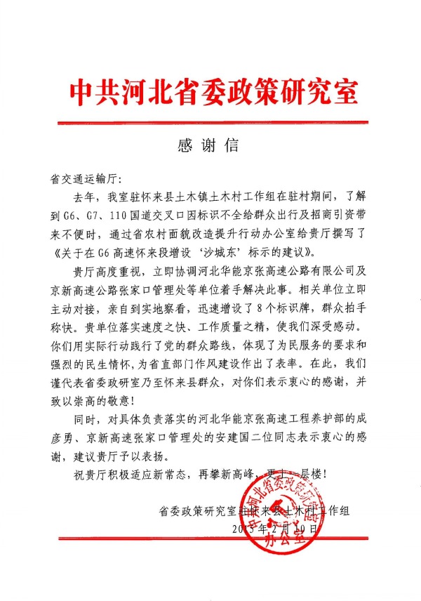 2月中旬,省委政策研究室駐懷來(lái)土木村工作組向省交通運(yùn)輸廳發(fā)出感謝信,代表省委政策研究室和當(dāng)?shù)厝罕,?duì)京張高速公司踐行群眾路線,積極落實(shí)道路標(biāo)牌整治建議表示感謝并致以崇高的敬意。