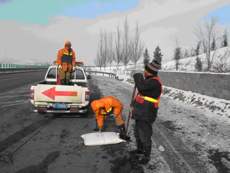 從11月10日早晨開(kāi)始,養(yǎng)護(hù)人員全部就位待命,各灑布車(chē)裝滿(mǎn)融雪劑,準(zhǔn)備隨時(shí)灑布。公司安排了兩輛巡查車(chē),分別向東西兩個(gè)方向開(kāi)始不間斷巡查,及時(shí)掌握最新雪情動(dòng)態(tài)。晚上,隨著大雪降臨,養(yǎng)護(hù)部門(mén)本著“先重點(diǎn)路段,后一般路段”的原則開(kāi)始在全線(xiàn)噴灑溶雪劑,以確保匝道、爬坡路段降雪及時(shí)融化,避免造成車(chē)輛“趴窩”,影響通行。到11日白天,又安排人員對(duì)重點(diǎn)路段進(jìn)行人工灑布,并派4臺(tái)除雪車(chē)上路推鏟積雪。12日,在降雪停止后,又安排200多人上路徹底清除路面積雪。由于除雪及時(shí),京張高速一直處于暢通狀態(tài),除由于進(jìn)京方向八達(dá)嶺高速積壓車(chē)輛造成車(chē)輛擁堵到京張路段,為保證安全,高速交警暫時(shí)封閉上口外,京張高速?zèng)]有因降雪而封閉,做到了省廳要求的24小時(shí)雙向四車(chē)道暢通,48小時(shí)路面無(wú)積雪。