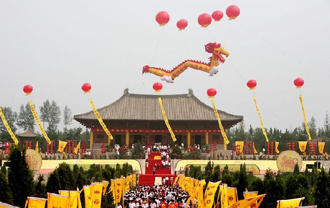 圖片說明:由海外華人捐資興建的中華三祖堂,位于軒轅湖以東,黃帝泉北200米處,是中國黃帝城文化旅游區(qū)的中心景點。三祖堂是一座仿唐建筑,重檐飛角,恢弘壯闊,全部木質結構。全堂占地104畝,由平面祭壇、三祖堂、后殿組成。殿內三位祖先的塑像姿態(tài)各異栩栩如生,居中的黃帝氣宇軒昂,右側的炎帝睿智儒雅,左側的蚩尤勇武彪悍,塑像高6米全部由泥土塑成。大殿四壁繪有涿鹿之戰(zhàn)、阪泉之戰(zhàn)、合符釜山、定都涿鹿四大歷史事件的大型壁畫。