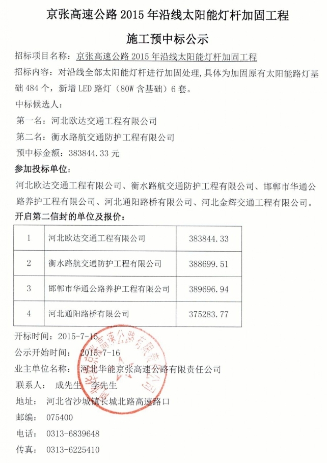 太能能燈桿加固工程施工預(yù)中標(biāo)公示